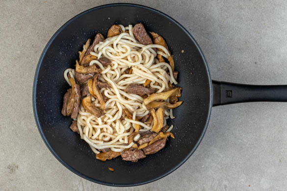 Das Fleisch trocken tupfen, mit je 1 kräftigen Prise Salz und Pfeffer zu den Pilzen geben und bei starker Hitze ca. 2Min. braten. Dann die Nudeln dazugeben und 1–2Min. mitbraten. Tipp: Sollten das Fleisch oder die Nudeln anhaften, 1EL Pflanzenöl unterrühren.