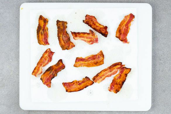 Die Baconscheiben halbieren und in einer großen Pfanne bei starker Hitze ca. 4Min. braten. Wenden und weitere 2–4Min. braten, bis der Bacon schön knusprig ist. Auf etwas Küchenkrepp abtropfen lassen.