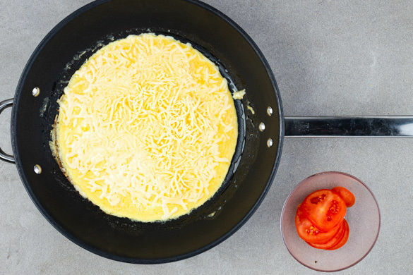 Kurz bevor das Omelett fertig ist, den Käse daraufstreuen, das Omelett zusammenklappen und abgedeckt bei geringer Hitze ca. 1Min. erwärmen, bis der Käse schmilzt. Die Tomate in dünne Scheiben schneiden.