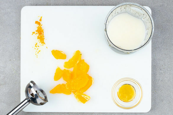 1TL Orangenschale abreiben, dann die Orange schälen. Die Fruchtsegmente auslösen, halbieren und mit dem Orangenabrieb, dem Joghurt, 150ml Wasser und 1EL Honig oder Ahornsirup in einem hohen Gefäß mit einem Stabmixer pürieren. Den Lassi bis zum Servieren kalt stellen.