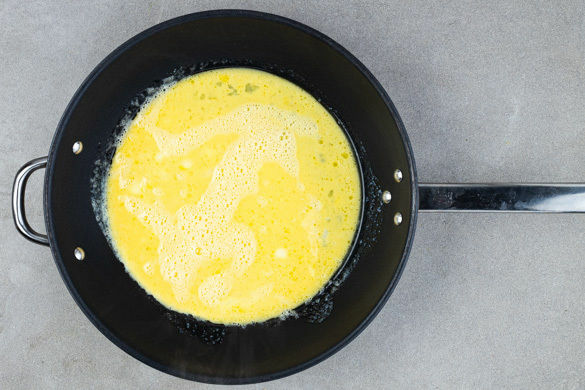 1TL Butter in der Pfanne schmelzen. Die Eier mit einer Gabel verquirlen, in die Pfanne gießen und bei mittlerer Hitze ca. 2Min. stocken lassen.