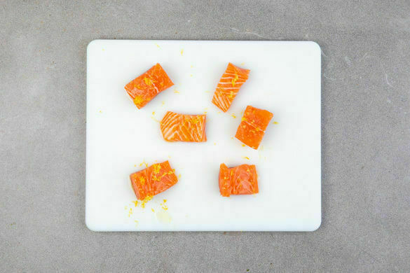 Den Lachs mit kaltem Wasser abspülen, trocken tupfen und in 10–12 gleich große Stücke schneiden, dabei evtl. vorhandene Gräten und die Haut entfernen. Mit der 1/2 der Zitronenschale und 2EL Olivenöl einreiben.