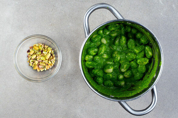 Die Gnocchi in ein Sieb abgießen, zurück in den Topf geben und mit dem Pesto vermengen. Die restlichen Pistazien grob hacken.
