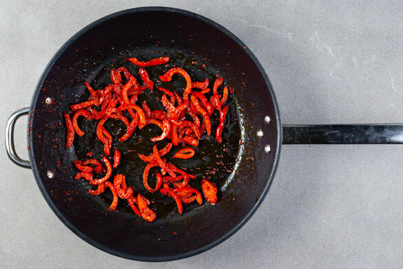 In einem mittelgroßen Topf ausreichend gesalzenes Wasser für die Gnocchi zum Kochen bringen. Die Paprika vierteln, entkernen und in dünne Streifen schneiden, diese einmal quer halbieren. Die Tomate in dünne Streifen schneiden. Das Gemüse in einer mittelgroßen Pfanne mit 1EL Olivenöl und 2 Prisen Salz bei mittlerer Hitze 7–9Min. anbraten, bis die Paprikastreifen weich sind.