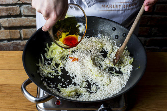 Die Zwiebeln in einer großen Pfanne mit 1EL Olivenöl bei mittlerer Hitze ca. 2Min. glasig anbraten. Den Reis und den Knoblauch dazugeben, kurz mitrösten, dann mit dem Safranwasser ablöschen und weitere 1–2Min. braten.