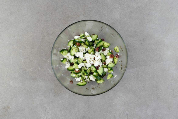 Die ½ der Minze mit 1EL Olivenöl, ½EL Essig, 1 kräftigen Prise Zucker und 1 Prise Salz verrühren. Die Gurke längs vierteln, in Scheiben schneiden und mit dem Minzedressing vermengen. Den Feta hineinkrümeln und die Oliven unterheben.