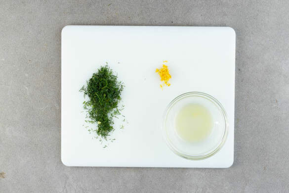 Den Dill samt Stängeln fein schneiden. 2TL Zitronenschale abreiben, dann die Zitrone halbieren und auspressen.