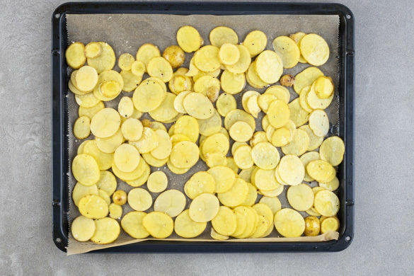 Die Kartoffeln samt Schale in max. 0,5cm dünne Scheiben schneiden und auf einem mit Backpapier ausgelegten Backblech mit 1EL Pflanzenöl und 1 Prise Salz vermengen. Gleichmäßig verteilen und 15–20Min. im Ofen rösten. In einem mittelgroßen Topf ausreichend gesalzenes Wasser für das Gemüse zum Kochen bringen.