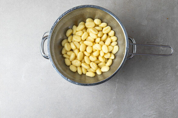 Die Gnocchi in das kochende Wasser geben und 4–5Min. kochen, bis sie an der Oberfläche schwimmen. Mit einer Tasse etwas Kochwasser abschöpfen, dann die Gnocchi in ein Sieb abgießen und abtropfen lassen.