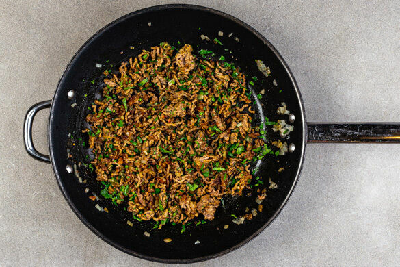 Das vegane Hackfleisch, die Zwiebeln und die Rosinen in einer großen Pfanne mit 2EL Olivenöl bei mittlerer bis starker Hitze 4–5Min. anbraten. Die Petersilie unterrühren und mit Salz und Pfeffer sowie der Gewürzmischung abschmecken.