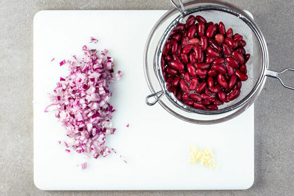 Den Backofen auf 200°C (180°C Umluft) vorheizen. Den Knoblauch schälen und fein würfeln. Die Zwiebel schälen, halbieren und ebenfalls fein würfeln. Die Bohnen in einem Sieb mit kaltem Wasser abspülen und abtropfen lassen.