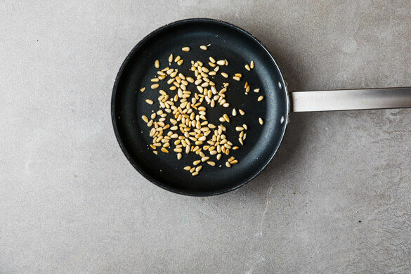 Die Pinienkerne in einer mittelgroßen Pfanne ohne Zugabe von Fett bei mittlerer Hitze 1–2Min. goldbraun anrösten. Vorsicht, sie können schnell zu dunkel werden. Zum Abkühlen aus der Pfanne nehmen und beiseitestellen.