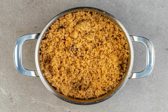 In einem kleinen Topf 300ml Wasser mit der ½ des Brühgewürzes und der ½ der Gewürzmischung zum Kochen bringen. Den Topf vom Herd nehmen, den Couscous und die Datteln in das kochende Wasser rühren und abgedeckt 6–8Min. quellen lassen. Den Couscous mit einer Gabel auflockern.