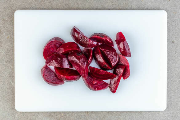 Die ½ der Roten Bete in ca. 1cm breite Spalten schneiden. Tipp: Wer mag, kann mehr Rote Bete verwenden.
