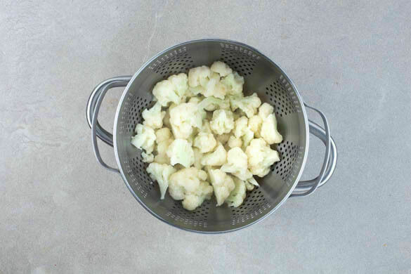 Den Blumenkohl in ca. 2cm große Röschen schneiden, den Strunk grob würfeln. In das kochende Wasser geben und einmal aufkochen lassen, dann die Hitze reduzieren und den Blumenkohl ca. 2Min. sanft köcheln lassen. In ein Sieb abgießen und abtropfen lassen.