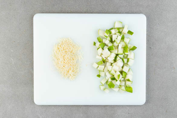 Den Käse grob reiben. Die Birnen vierteln, entkernen und in 1–2cm große Stücke schneiden.