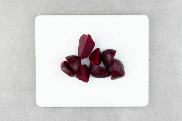 Die ½ der Roten Beten abgießen und jeweils vierteln. Tipp: Wer mag, kann auch mehr Rote Bete verwenden.