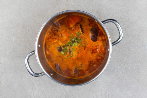 Heute geht es deftig zu: Borschtsch wärmt Leib und Seele mit den erdigen Aromen von Roter Bete und Kartoffeln. Die Ergänzung mit Rindergulasch ist angelehnt an die baltische Borschtsch-Variante „Beetenbartsch“. Obendrauf gibt es ganz klassisch saure Sahne und Dill, und dazu noch eine Handvoll knuspriger Röstzwiebeln. Ein Festmahl!