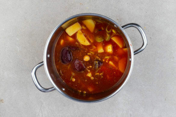 Die Kartoffeln schälen und je nach Größe halbieren oder vierteln. 600ml heißes Wasser angießen, dann die Rote Bete, die Kartoffeln und das Brühgewürz einrühren. Die Suppe abgedeckt 15–20Min. köcheln lassen, bis die Kartoffeln vollständig gegart sind.