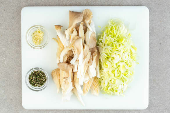 Die Pilze in mundgerechte Streifen zupfen. Den Lauch längs halbieren und quer in feine Streifen schneiden. Den Knoblauch schälen und fein hacken. Die Rosmarinnadeln und Thymianblätter von den Stängeln zupfen und fein schneiden. Tipp: Wer möchte, kann die Kräuter mitsamt der Stängel verwenden und nach dem Braten einfach aus der Pfanne nehmen.