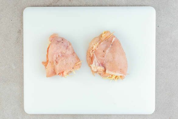 Das Fleisch trocken tupfen, horizontal halbieren und zwischen zwei Lagen Frischhaltefolie oder Backpapier mit einem Fleischklopfer oder dem Boden einer schweren Pfanne ca. 0,5cm dünn klopfen. Von beiden Seiten mit je 1 Prise Salz und Pfeffer würzen. Das Fleisch einseitig mit 1EL Käse und 1–2 Scheiben Schinken belegen, zusammenklappen und mit einem Zahnstocher verschließen.