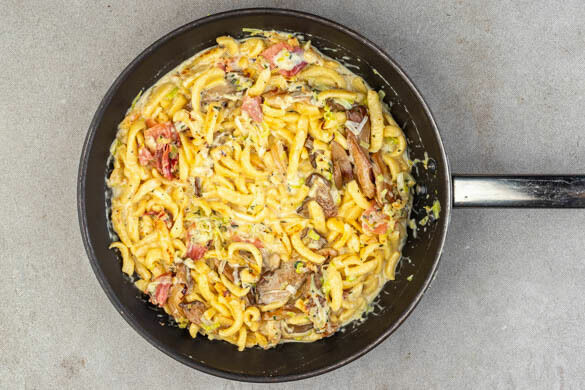 Den übrigen Schinken in Stücke schneiden. Die Pilze in einer zweiten Pfanne mit 4EL Pflanzenöl bei mittlerer bis starker Hitze in 3–4Min. goldbraun und knusprig braten. Die Hitze reduzieren, den Lauch, den Knoblauch, die Kräuter und den Schinken zugeben und 2–4Min. braten, bis der Lauch anfängt glasig zu werden. Die Spätzle zugeben und 2–3Min. mitbraten.
