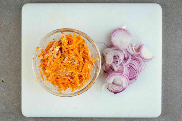 Die Karotten ggf. schälen und grob raspeln. Den Knoblauch schälen und fein reiben. Die Zwiebeln schälen, halbieren und in feine Streifen schneiden. Die Karotten mit dem Knoblauch, 2EL Mayonnaise, 1EL Essig und je 1 kräftigen Prise Salz und Pfeffer vermengen.