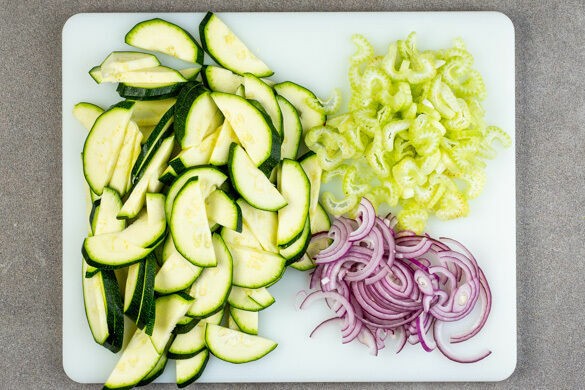 Die Zucchini längs halbieren und quer in dünne Scheiben schneiden. Den Stangensellerie in dünne Scheiben schneiden. Die Zwiebeln schälen, halbieren und in feine Streifen schneiden.