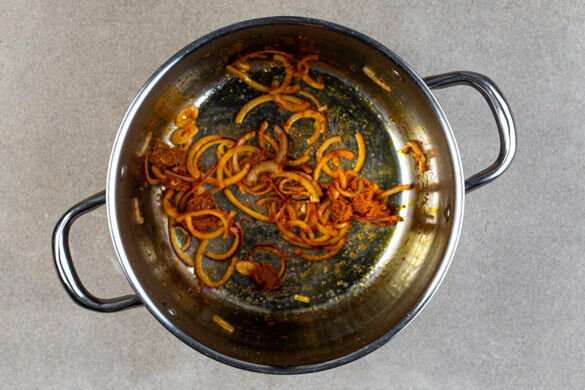 Die Zwiebeln in einem großen Topf mit 1EL Pflanzenöl und der Currypaste bei mittlerer Hitze 1–2Min. anbraten.