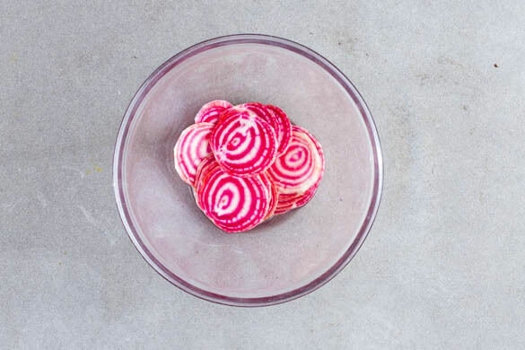 Den Backofen auf 220°C (200°C Umluft) vorheizen. Die Chioggia-Bete schälen und in möglichst dünne Scheiben schneiden. 2EL hellen Essig mit 1EL Wasser, 1TL Zucker und 1 kräftigen Prise Salz gut verrühren und mit der Chioggia-Bete vermengen. Tipp: Für extra dünne Scheiben eine Mandoline verwenden.