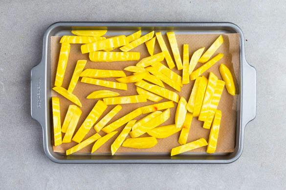 Die gelben Beten ebenfalls schälen und in ca. 1cm dicke, pommesähnliche Stifte schneiden. Auf einem mit Backpapier ausgelegten Backblech mit 2EL Olivenöl und 1 kräftigen Prise Salz vermengen und im Ofen in 22–25Min. goldbraun backen.
