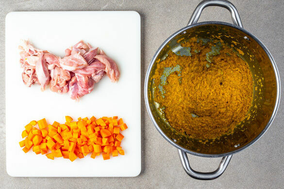 Die Würzpaste in einem mittelgroßen Topf mit 2EL Butter bei mittlerer Hitze ca. 7Min. unter Rühren anbraten. Die Karotte ggf. schälen und in ca. 1cm große Würfel schneiden. Das Fleisch trocken tupfen und ggf. in kleinere Stückchen schneiden.