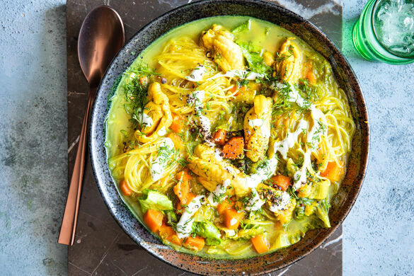 Die Suppe auf tiefe Teller verteilen, mit dem Joghurt beträufeln und mit dem restlichen Dill garniert servieren. Tipp: Wer mag, kann 6–8 Nudeln in einer Pfanne mit etwas Pflanzenöl bei mittlerer Hitze kurz anbraten und als knuspriges Topping über die Suppe streuen.