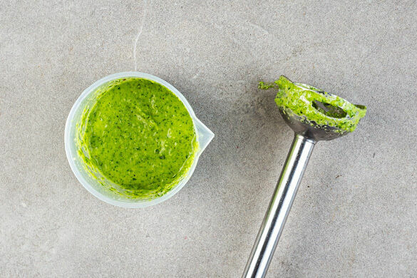 In einem Wasserkocher die notwendige Mindestmenge an Wasser aufkochen und die Cashews in einem hohen Gefäß mit 100ml kochendem Wasser übergießen. Den Knoblauch schälen und grob würfeln. Das Basilikum und die Petersilie samt Stängeln grob schneiden, dabei einige Petersilienblätter für die Garnitur beiseitelegen.