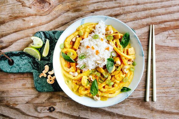 Ein Curry, das mit der Sonne um die Wette strahlen könnte. Die tolle Farbe, die auf deinem Teller so herrlich leuchtet, ist das Ergebnis einer köstlichen Komposition aus cremiger Kokosmilchsauce, die mit gelber Currypaste verfeinert wird, sowie Paprika, Süßkartoffel und getrockneten Aprikosen. Serviert wird der vegane Seelentröster mit leckerem Jasminreis, gerösteten Cashews und aromatischem Thai-Basilikum.