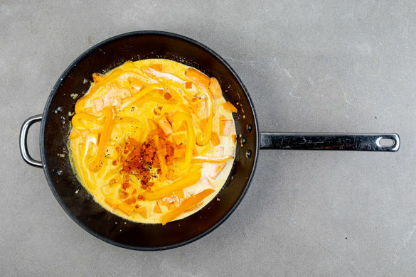 Die Aprikosen, die ½ der Currypaste, die Kokosmilch und 50ml Wasser zum Gemüse geben und bei niedriger Hitze weitere 10–12Min. sanft köcheln lassen, bis die Süßkartoffeln gar sind. Mit Salz und Pfeffer abschmecken und ggf. etwas mehr Wasser hinzugeben. Tipp: Wer es gerne schärfer mag, kann die ganze Currypaste verwenden.