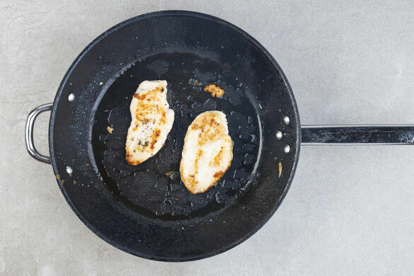Das Fleisch trocken tupfen, von beiden Seiten mit Salz und Pfeffer würzen und in der Pfanne mit 2EL Olivenöl bei mittlerer Hitze auf jeder Seite 4–5Min. anbraten, bis das Fleisch durch ist. Die Pfanne vom Herd nehmen.