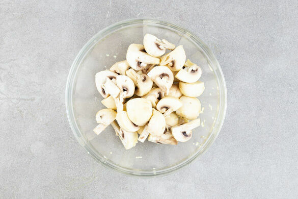 Die Pilze ggf. säubern und vierteln. Den Knoblauch schälen und fein reiben oder durch eine Knoblauchpresse drücken. Ca. ¼ des Knoblauchs für das Dressing aufbewahren, den übrigen Knoblauch mit 2EL Olivenöl verrühren und unter die Pilze mengen.