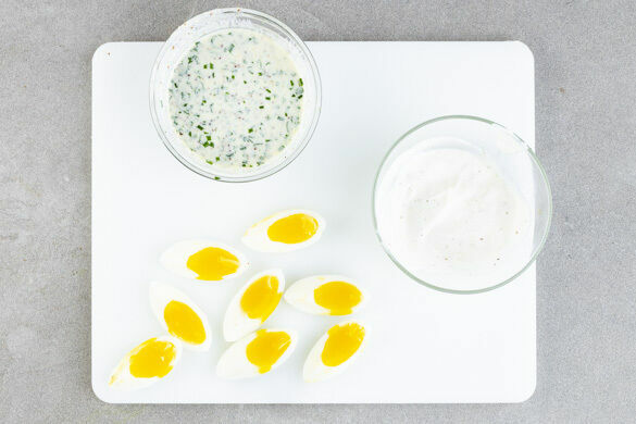 Die Petersilie samt Stängeln fein hacken. Den Schnittlauch in kleine Röllchen schneiden. Die ½ des Joghurts mit den Kräutern, 1,5EL körnigem Senf, 1EL Olivenöl, 2EL Essig, 1EL Wasser, ½TL Salz und 1 Prise Pfeffer verrühren. Den restlichen Joghurt mit dem restlichen Knoblauch und 1 Prise Salz verrühren. Die Eier schälen und längs vierteln.