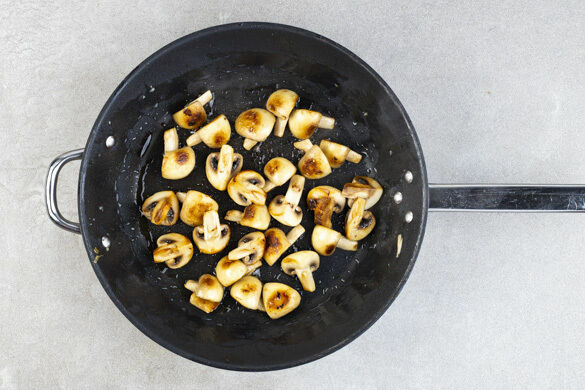 Die Pilze samt Knoblauchöl in einer großen Pfanne bei starker Hitze 6–7Min. rundum goldbraun anbraten. Auf einem Teller mit Salz und Pfeffer würzen und beiseitestellen. Die Pfanne auswischen.