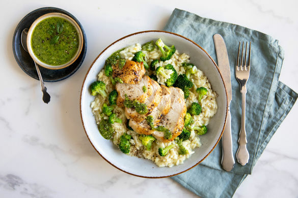 Ein cremiges Risotto ist gar nicht schwer in der Zubereitung und einfach immer wieder köstlich! Erst recht, wenn es wie hier mit zartem Bio-Hähnchenfleisch, feinen Brokkoliröschen und einem selbst gemachten Pesto aus frischem Basilikum und knackigen Cashews daherkommt. Lasst es euch schmecken!