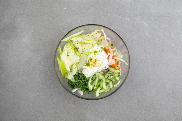 Den Apfel vierteln, entkernen und in dünne Scheiben schneiden. Die Limettenschale abreiben, dann die Limette halbieren und auspressen. Die Sonnenblumenkerne in einer Grillpfanne ohne Zugabe von Fett bei mittlerer Hitze 1–2Min. goldbraun anrösten, dann herausnehmen.