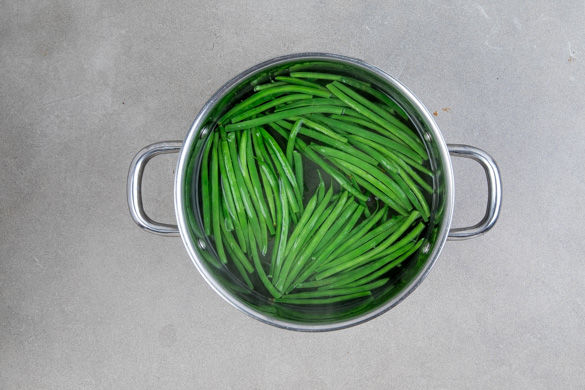 In einem mittelgroßen Topf ausreichend leicht gesalzenes Wasser für die Bohnen zum Kochen bringen. Die Enden der Bohnen abschneiden, die Bohnen ggf. quer halbieren. Sobald das Wasser kocht, die Bohnen hineingeben und ca. 2–3Min. garen, in ein Sieb abgießen, mit kaltem Wasser abschrecken und abtropfen lassen.