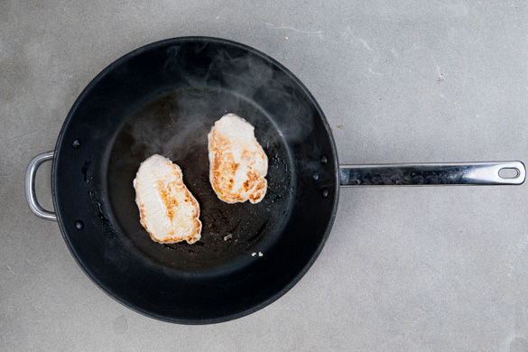 Das Fleisch mit etwas Küchenkrepp trocken tupfen, mit Salz und Pfeffer würzen und in einer großen Pfanne mit 1EL Olivenöl bei mittlerer Hitze ca. 2–3Min. von jeder Seite goldbraun anbraten. Das Fleisch aus der Pfanne nehmen und auf einem Teller ruhen lassen.