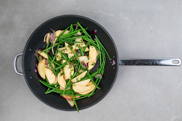 Die Zwiebeln in derselben Pfanne mit 1EL Olivenöl bei mittlerer Hitze ca. 1Min. anbraten. Die Bohnen und die Apfelscheiben dazugeben und 2–3Min. mitbraten, bis die Bohnen gar sind. Das Gemüse mit Salz und Pfeffer würzen.