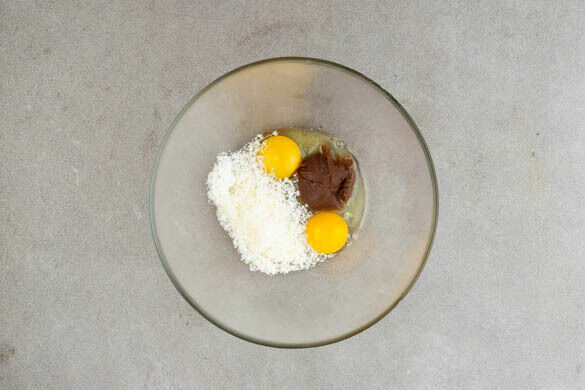 In einem großen Topf ausreichend gesalzenes Wasser für die Pasta zum Kochen bringen. In einer hitzebeständigen Schüssel (siehe Kochtipp) 1 Ei, 3 Eigelbe, die Misopaste und den übrigen Zitronensaft verquirlen. Den Käse fein reiben, 3–4EL Käse für die Garnitur aufbewahren, den übrigen Käse mit je ½TL Salz und Pfeffer unterrühren.
