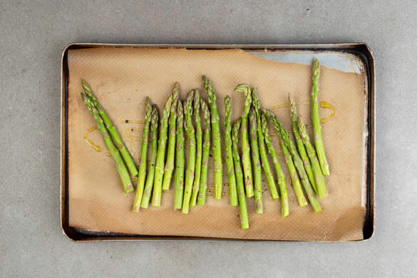 Die hölzernen Enden des Spargels abbrechen und das untere Drittel des Spargels ggf. schälen. Den Spargel auf einem mit Backpapier ausgelegten Backblech mit 2EL Olivenöl und je ¼TL Salz und Pfeffer vermengen, dann 8–12Min. im Ofen grillen, bis der Spargel gebräunt und bissfest ist, dabei nach der Hälfte der Zeit wenden. Die Pasta im kochenden Wasser in 7–9Min. bissfest kochen.