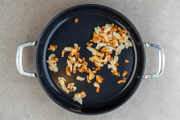 Den Backofen mit Grillfunktion oder Ober-/Unterhitze auf 250°C vorheizen. In einem großen Topf ausreichend gesalzenes Wasser für die Pasta zum Kochen bringen. Die Kokosraspel in einer großen, tiefen Pfanne ohne Zugabe von Fett bei mittlerer Hitze in 1–2Min. goldbraun anrösten. Sofort aus der Pfanne nehmen und beiseitestellen. Die Pfanne wird weiterverwendet.