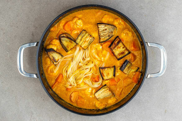 RS Gelbes Garnelencurry Thai-Style mit Tagliatelle, Auberginen und Kokosraspel