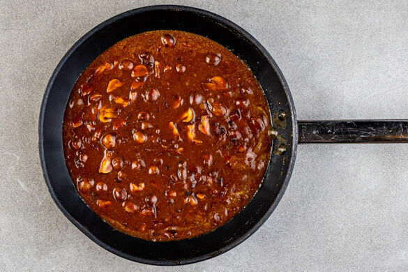 4EL Mehl und das Brühgewürz unter die Pilze mengen. Bei niedriger Hitze langsam 500ml Wasser und 100ml Milch angießen, dabei stetig rühren. Die Sauce 2–3Min. einköcheln lassen und mit Salz und Pfeffer abschmecken. Bis zum Servieren abgedeckt warm halten.